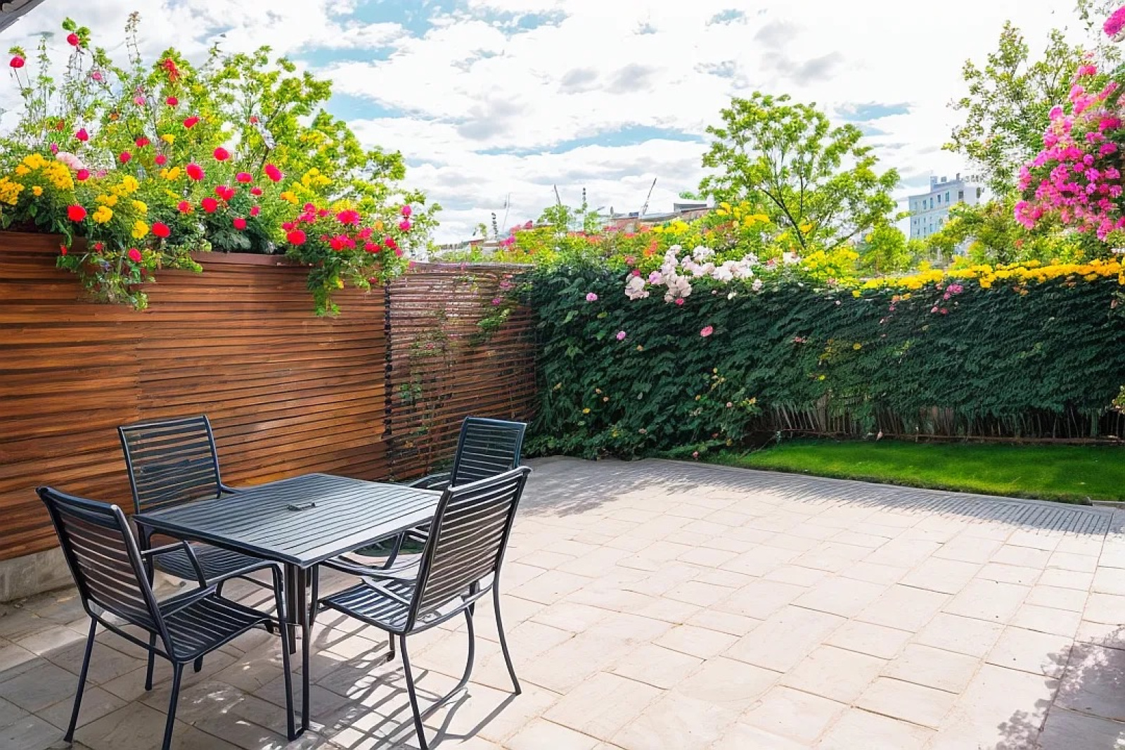 Extérieurs : la propriété propose une cour soignée, un garage individuel, une belle terrasse offrant une vue dégagée sur le jardin engazonné et arboré.