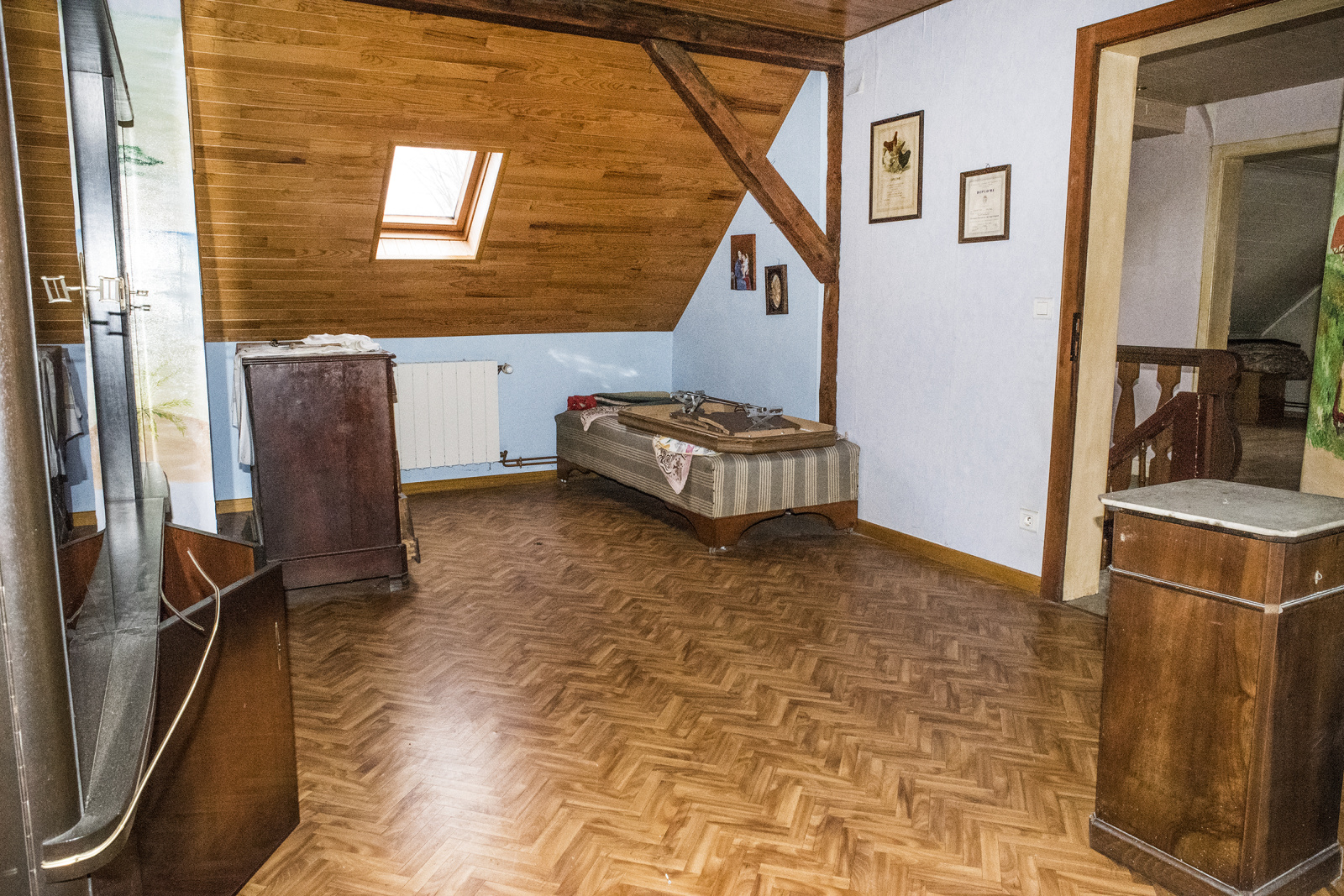 À l’étage, un palier distribue trois chambres, offrant des volumes confortables et une atmosphère propice à la vie familiale.