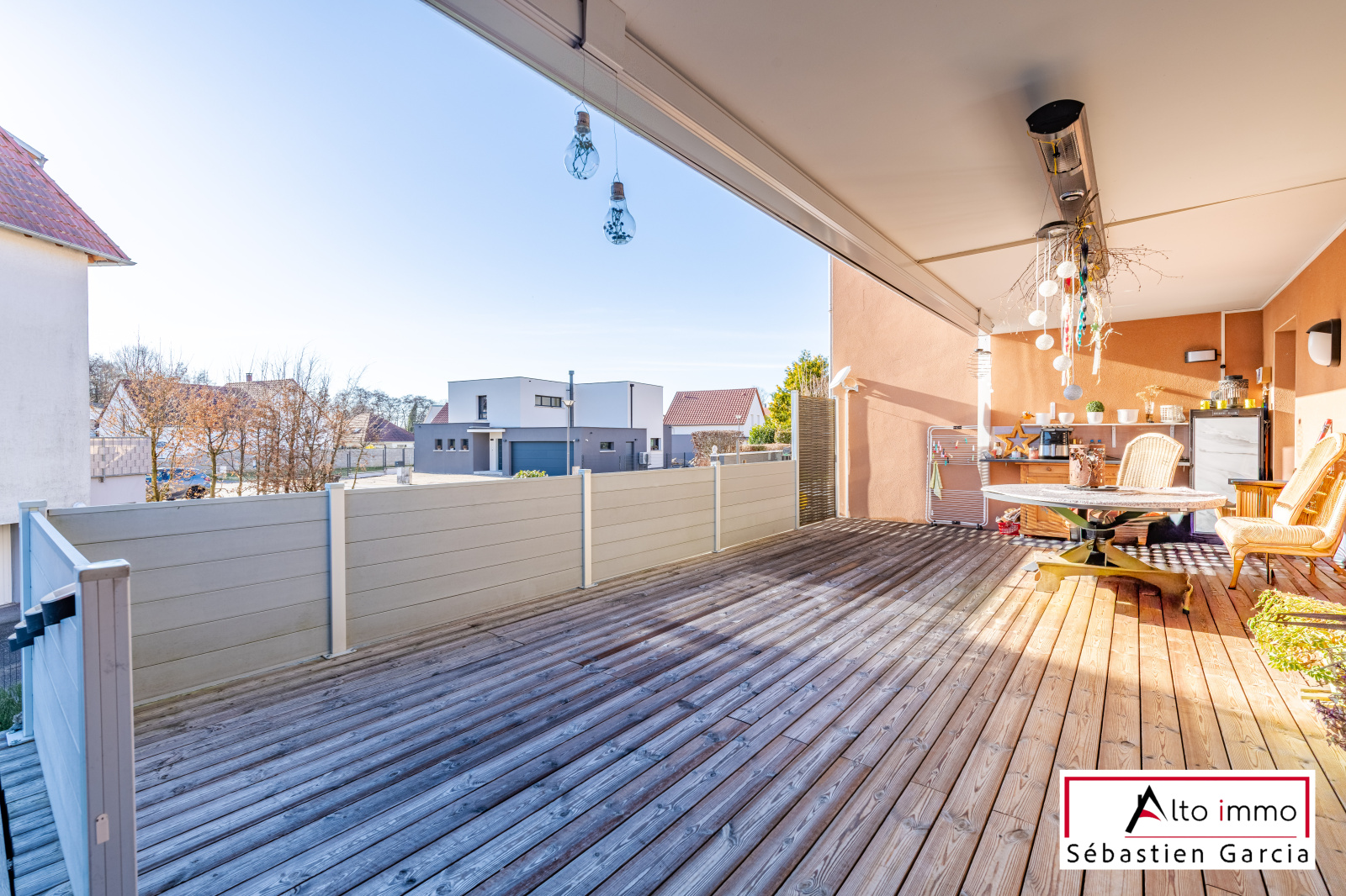 Une superbe terrasse de 42 m² exposée sud, équipée d'un store banne électrique, d'une cuisine d'été et de son accès sur un jardin privè de 200m²!