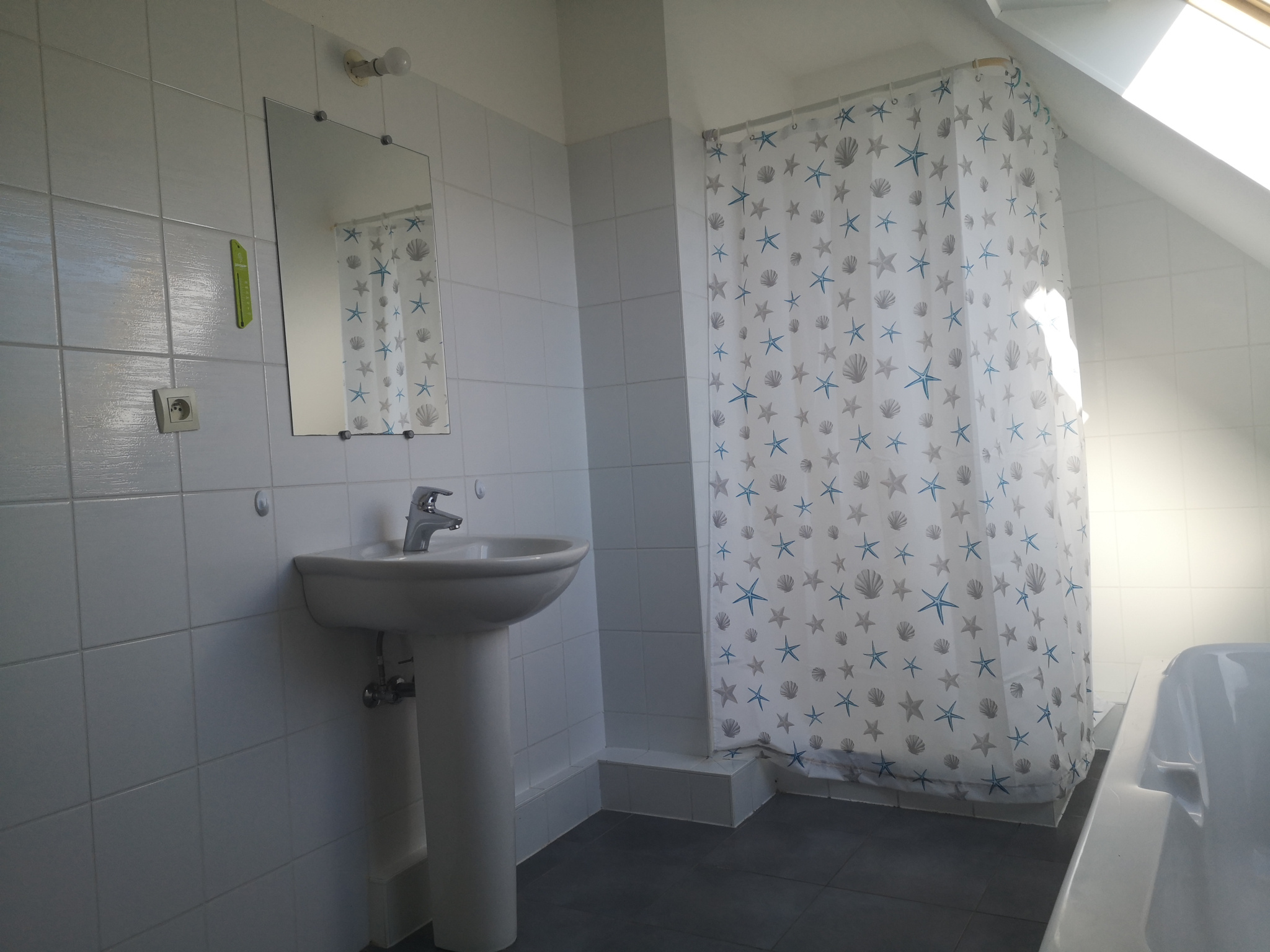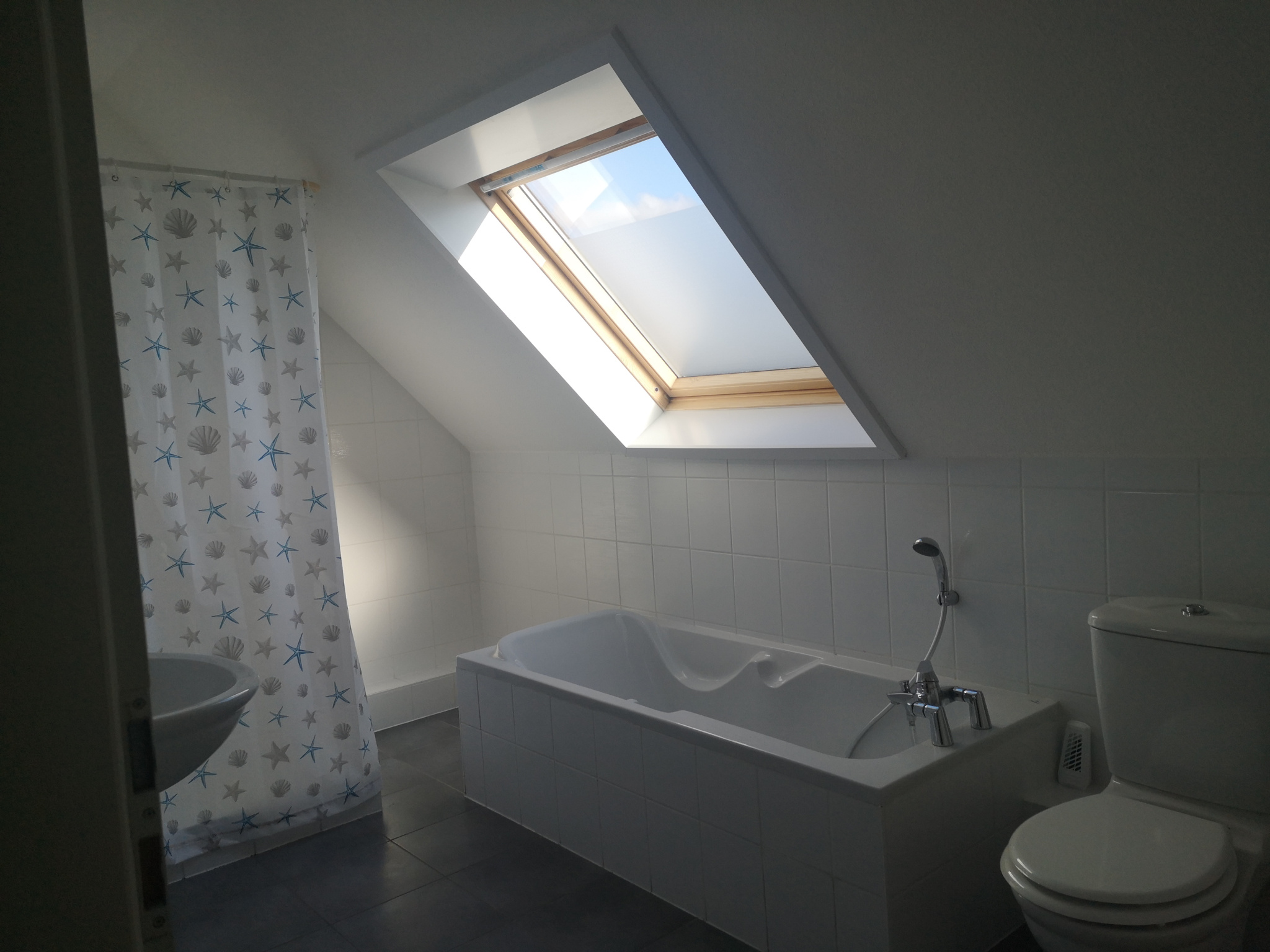 1er niveau : le palier dessert 2 chambres de 14,25 et 16,36 m² plus une pièce (bureau, salle de jeux, chambre bébé...) de 10 m². Ces surfaces sont les surfaces au sol. Une salle de bain composée d'une baignoire, une douche, un lavabo et les toilettes. Une trappe d'accès pour se rendre au grenier.