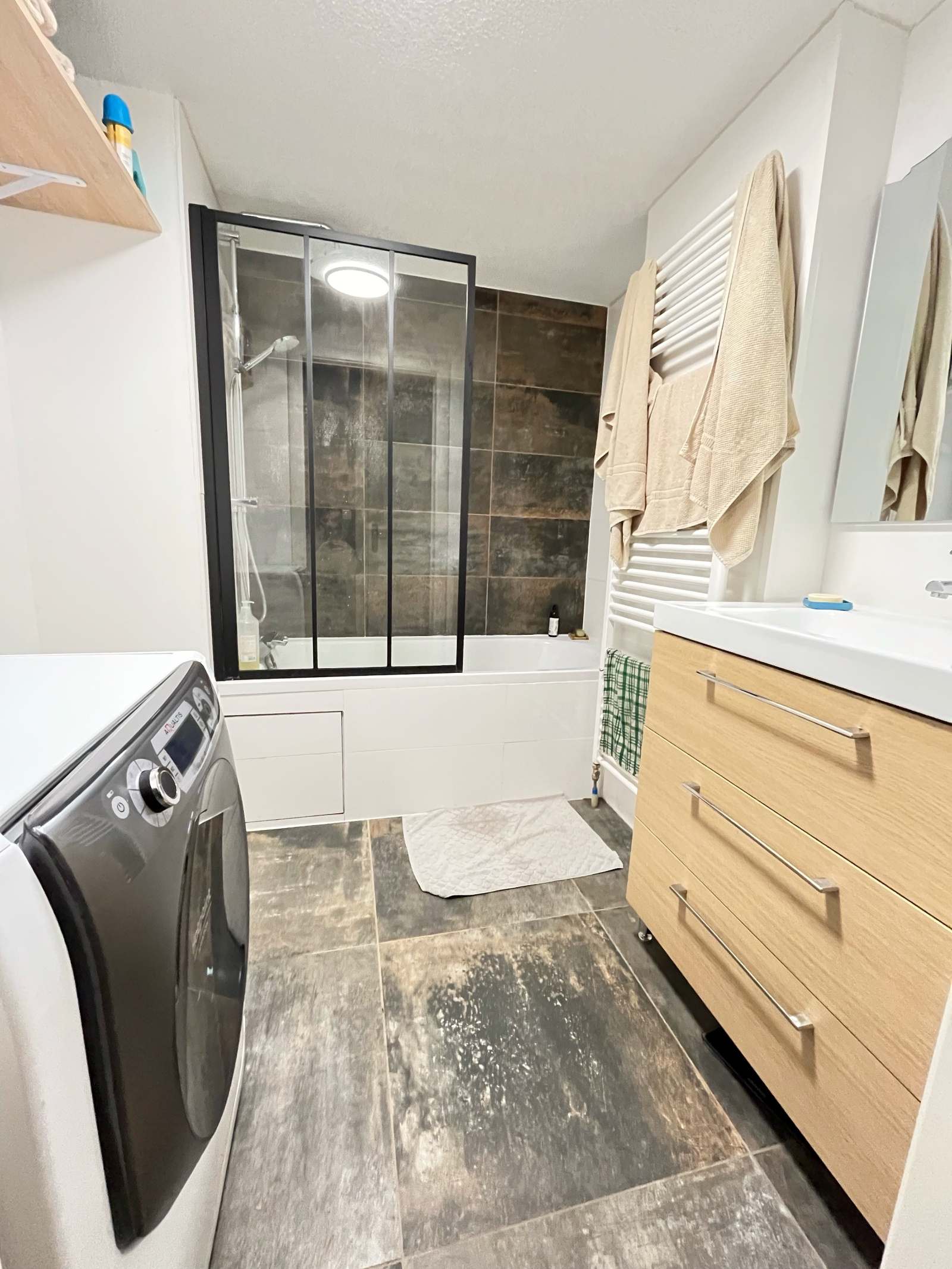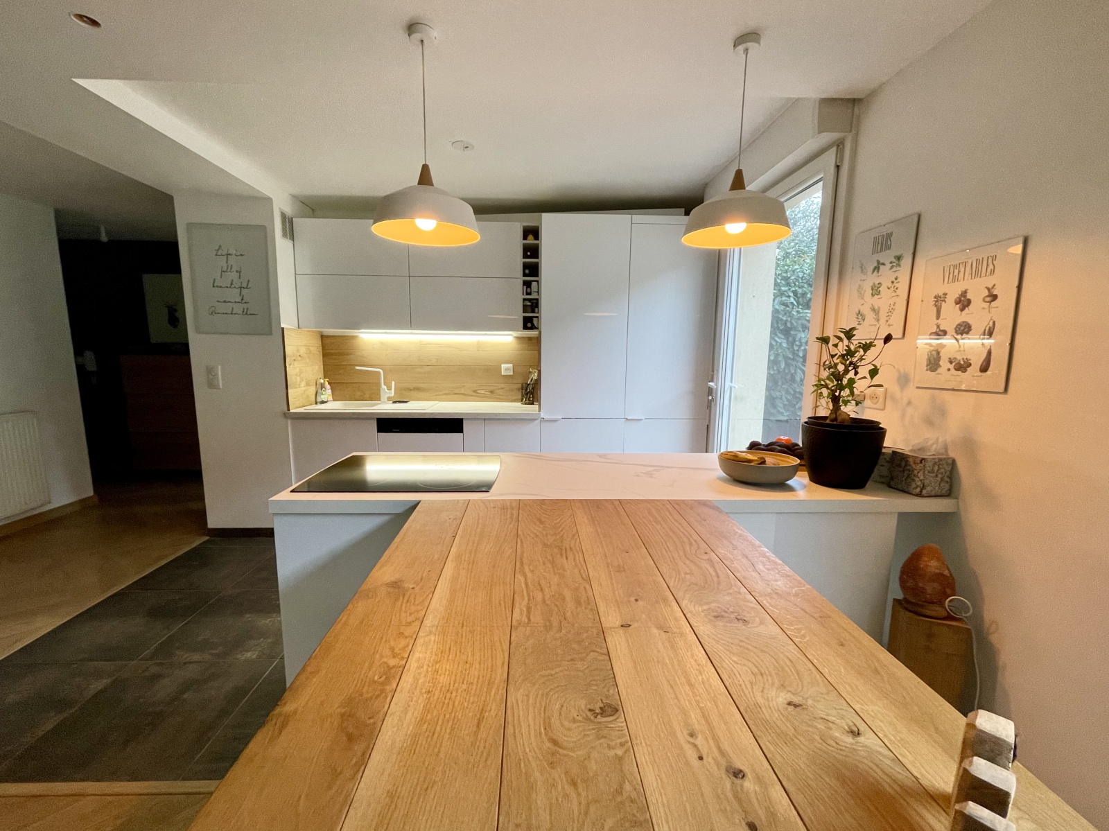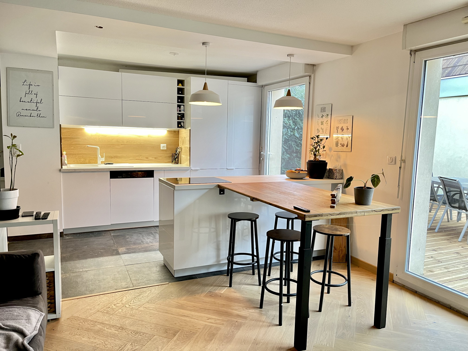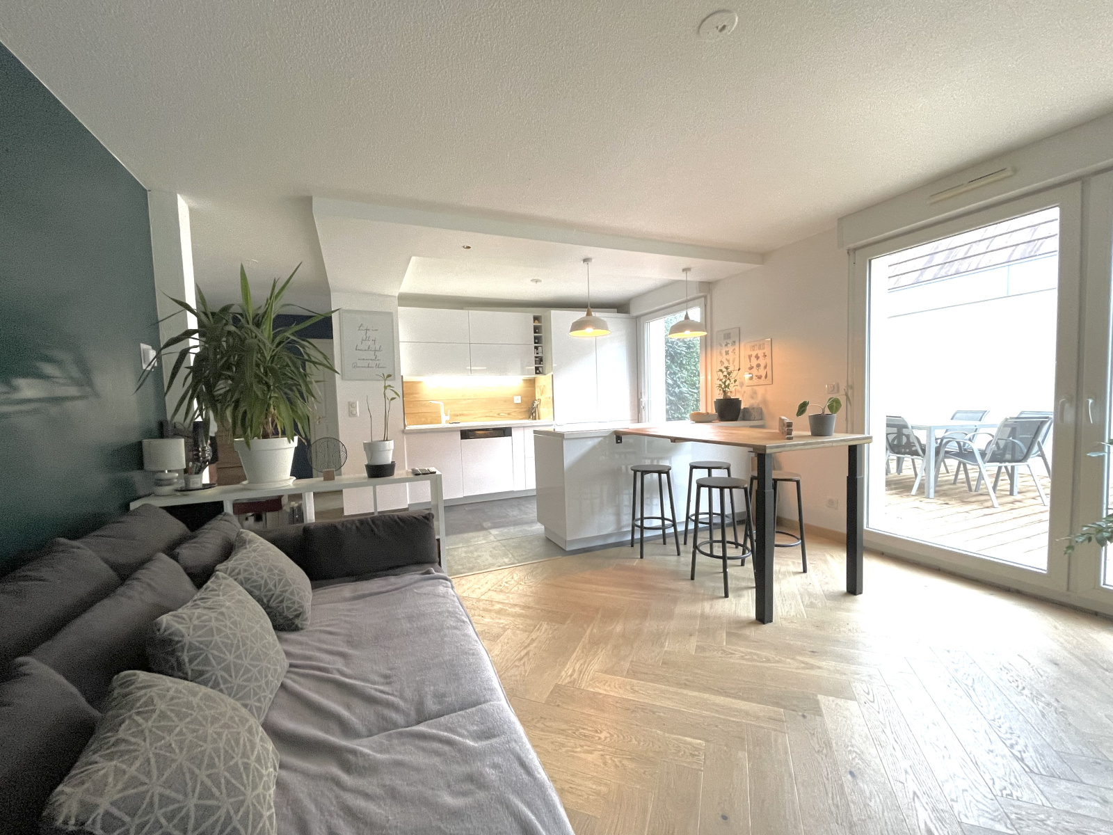 Appartement 3 pièces contemporain situé en rez de jardin (210m2 de terrain) avec belle terrasse en bois sur plots de 30m2, pelouse/potager/compost/partie engazonnée sur 150m2. Entièrement rénové en 2022, il offre un beau séjour lumineux donnant directement sur l'extérieur. La cuisine américaine a été entièrement équipée et meublée à neuf, avec un îlot central de cuisson prolongé d'une table et de 4 assises.