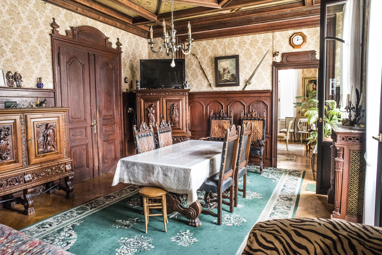 Cette maison séduit aussi par ses sublimes éléments décoratifs intérieurs : plafonds moulurés uniques, dont un plafond exceptionnellement orné dans le salon, portes anciennes en bois massif finement sculptées, et finitions d’époque préservées qui racontent une histoire à chaque pas.