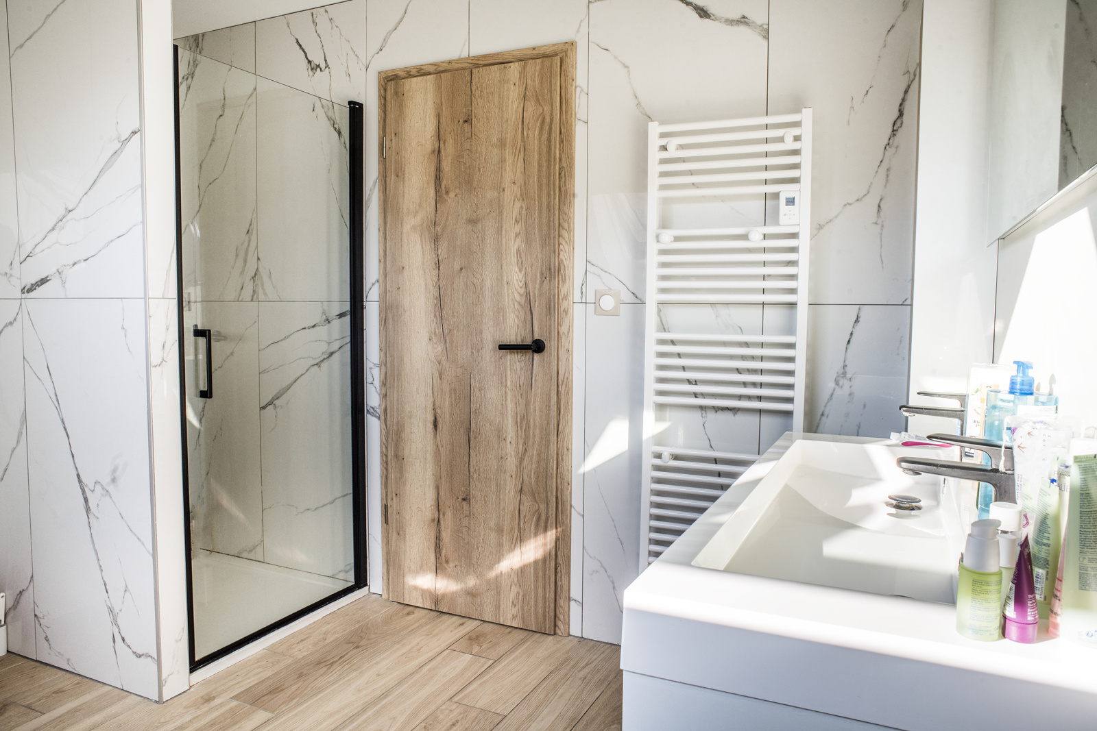 Un WC suspendu indépendant se trouve à proximité de l’entrée, et un accès direct au garage via le cellier rend chaque retour de courses plus simple et fluide.