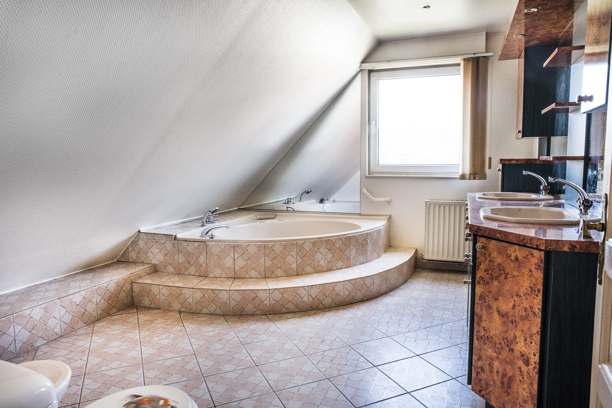 À l’étage, un palier dessert deux chambres lumineuses ainsi qu’une salle de bain confortable, équipée d’une baignoire d’angle, de deux vasques et d’un WC.