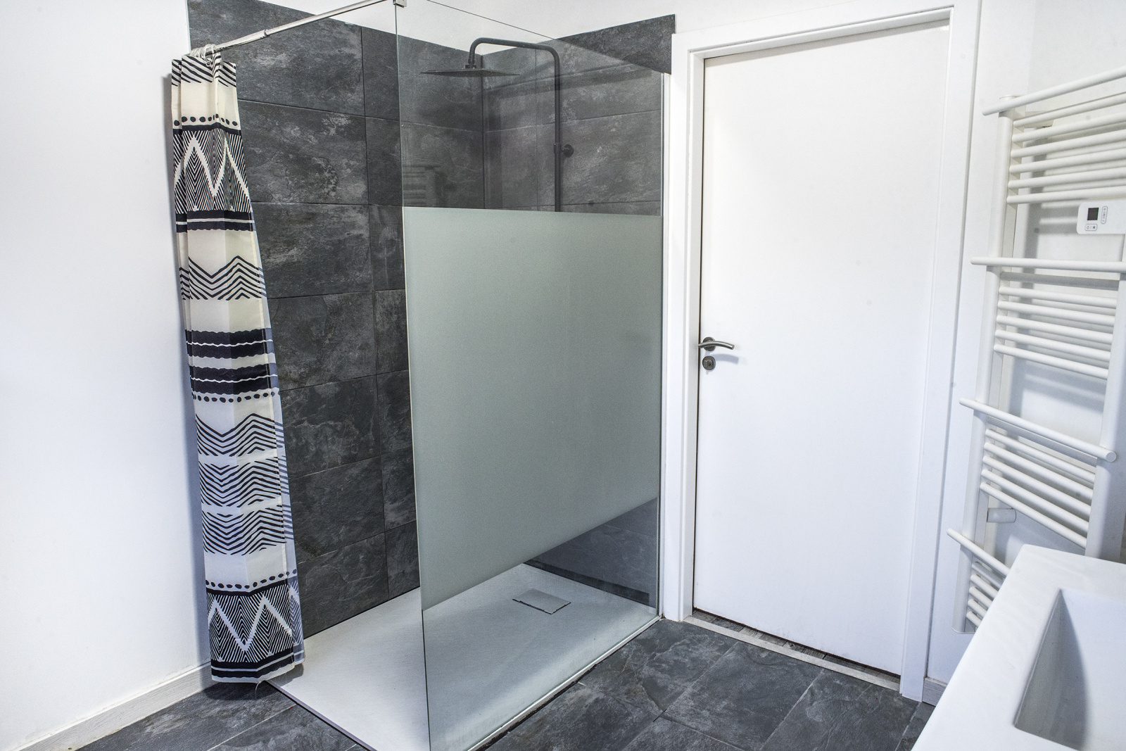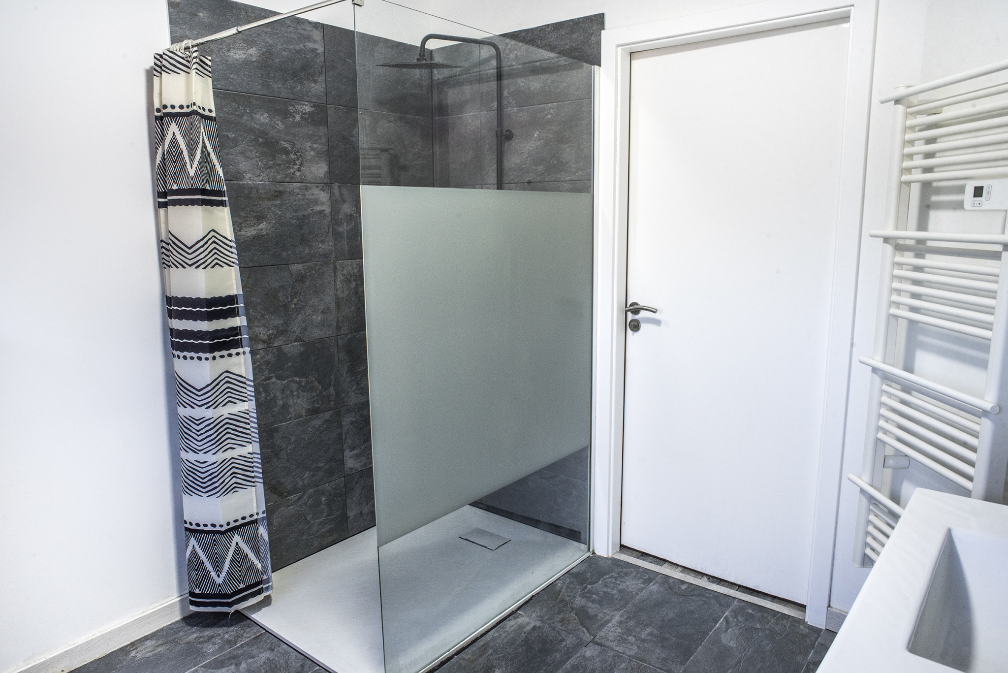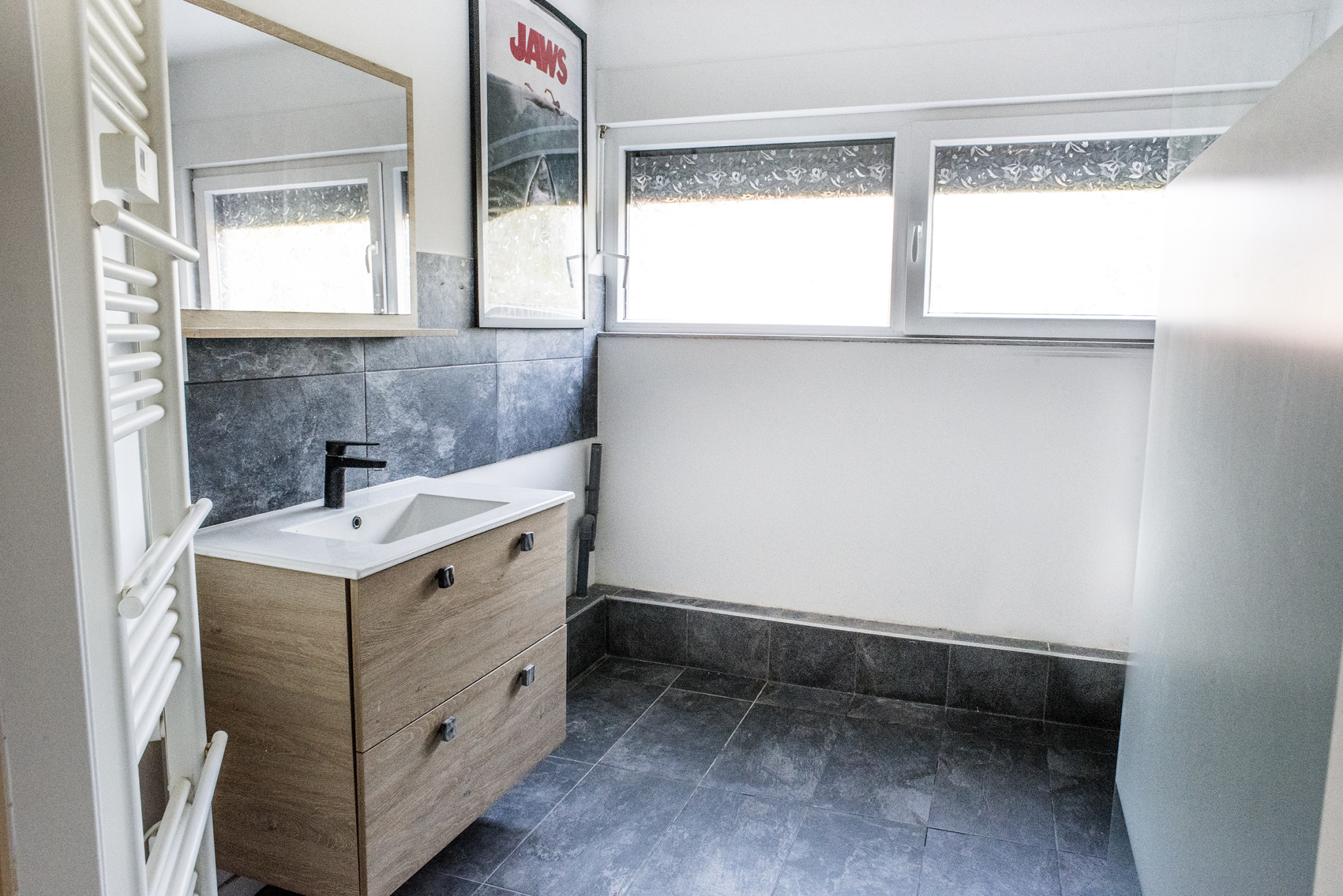 Une salle d’eau raffinée complète l’étage, équipée d’une vasque posée sur meuble design, d’une douche à l’italienne et d’un second WC.