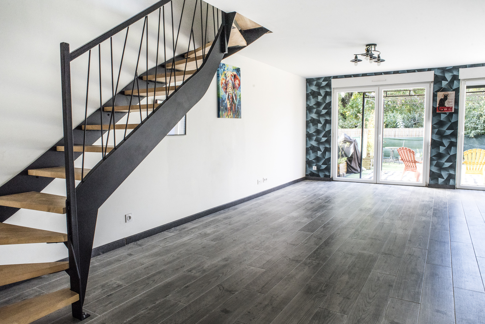 L’accès à l’étage se fait par un escalier moderne sans contremarche, laissant passer la lumière pour une atmosphère encore plus aérienne. À l’étage, le palier dessert trois belles chambres, dont une suite parentale avec espace dressing. De hautes fenêtres verticales apportent une luminosité naturelle et élégante à chaque pièce.