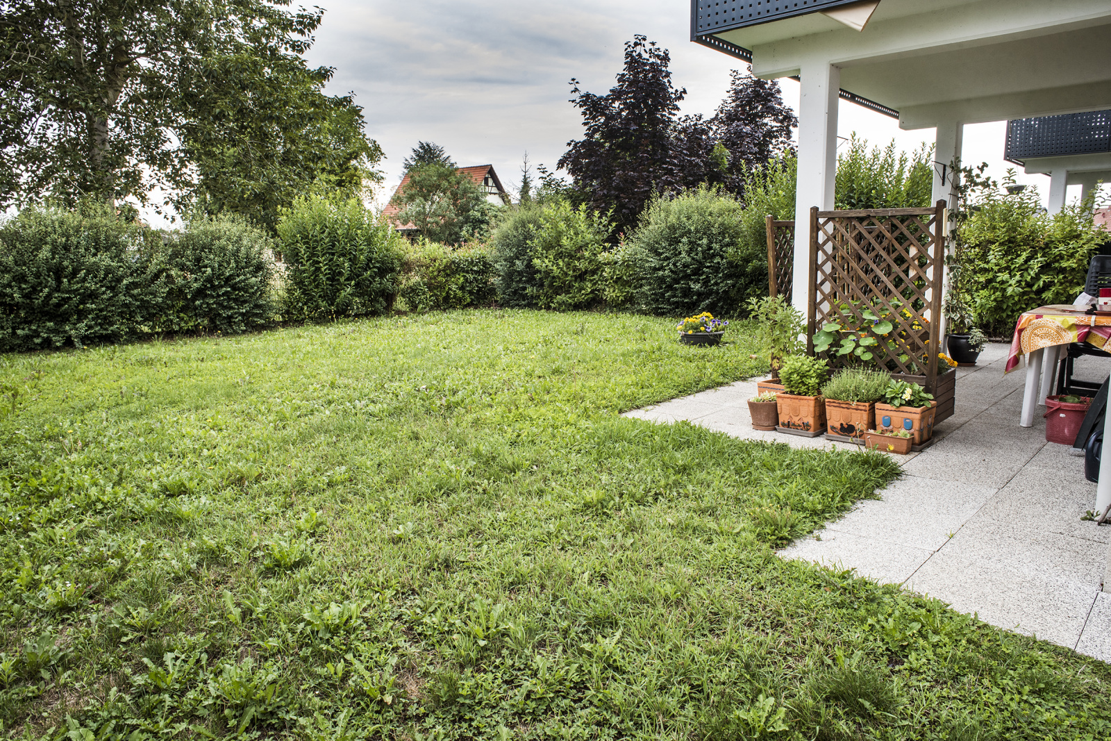 Dès l’entrée, vous serez accueilli par un hall spacieux avec placard-penderie intégré, idéal pour organiser vos effets personnels. Sur votre droite, le cœur de l’appartement s’ouvre à vous : un vaste salon-séjour baigné de lumière, ouvert sur une cuisine entièrement équipée avec coin repas. Ce bel espace de vie vous donne un accès direct, depuis trois ouvertures, à un jardin privatif engazonné, joliment arboré et à l’abri des regards grâce à une haie végétale soigneusement entretenue. Une agréable terrasse couverte prolonge cet espace extérieur, parfaite pour vos repas ou moments de détente à l’ombre.