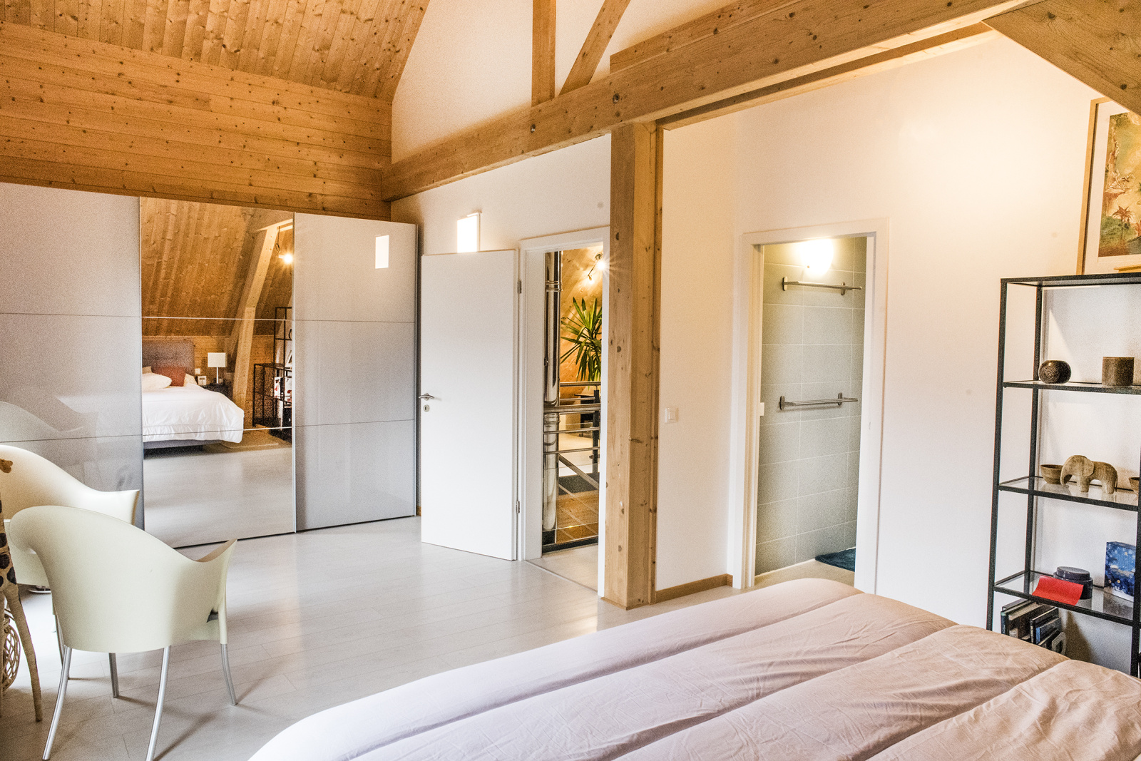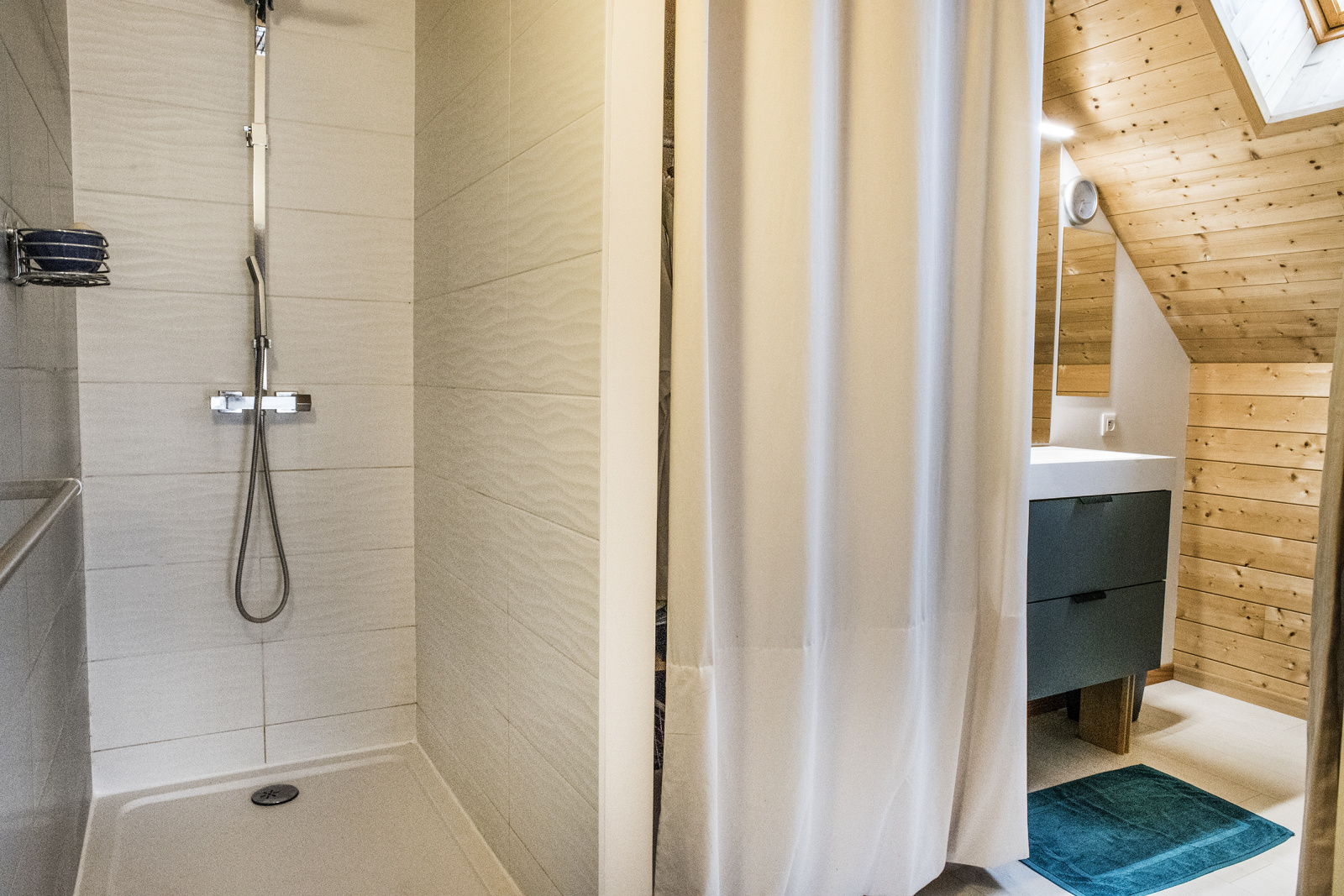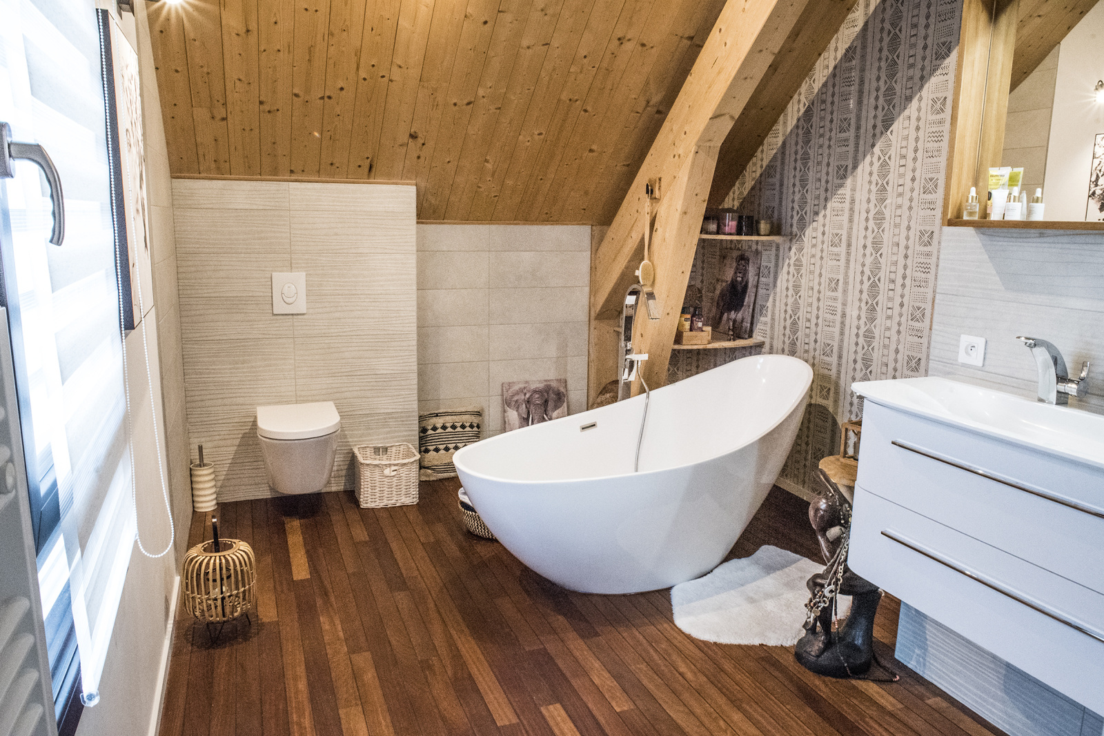 Une grande mezzanine avec un espace bureau spacieux et une magnifique fenêtre triangulaire offrant une vue imprenable sur le jardin. Ce niveau comprend deux chambres, l'une avec toit cathédrale, dispose d'un dressing et d’une salle d’eau privative. Mais aussi une salle de bain moderne, avec une baignoire îlot au design épuré, apportant un bel équilibre entre esthétique et fonctionnalité.
