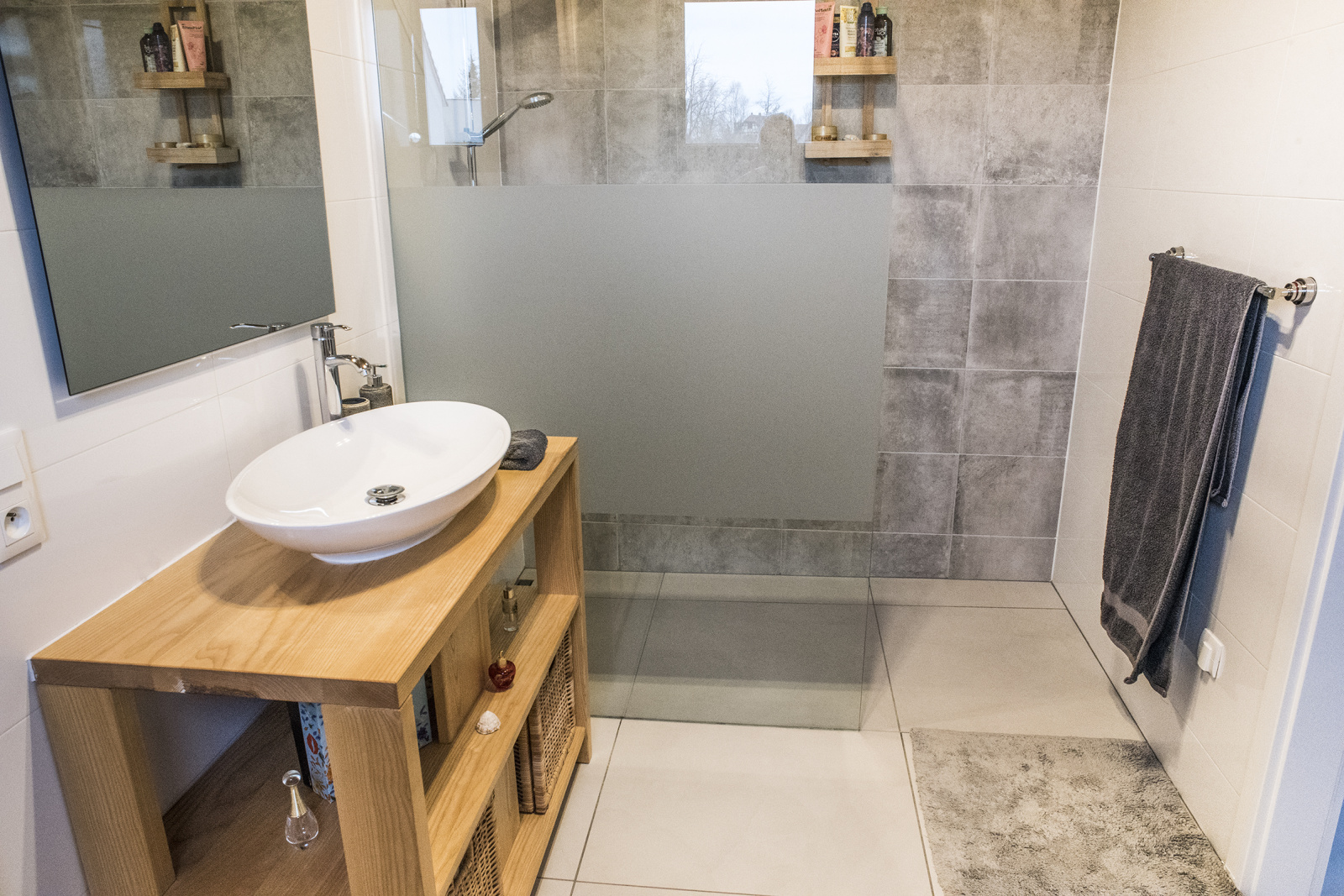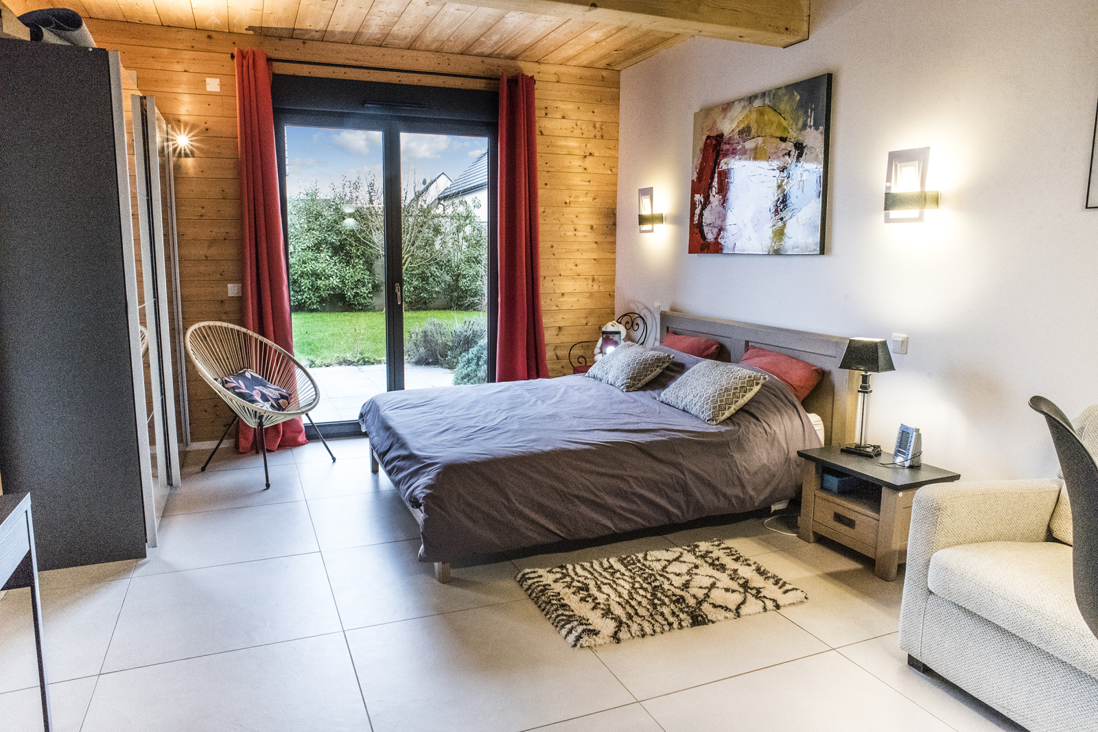 Une entrée avec placard/penderie, une cuisine américaine entièrement équipée ouverte sur un grand espace de vie, un coin repas lumineux donnant accès à une terrasse de 45 m². Le salon, avec vue dégagée sur le jardin, se prolonge également sur la terrasse. Un poêle à bois, installé au centre de la pièce principale, apporte une touche supplémentaire de confort et de charme, tout en chauffant l'ensemble de la maison. Ce niveau comprend aussi un WC séparé ainsi qu’un studio indépendant de 37 m², parfait pour accueillir des invités ou un adolescent. Il peut éventuellement convenir pour une bi-famille ou RB&B. Ce studio dispose d’une entrée privée, d’une cuisine complète, d’une chambre avec vue sur le jardin et d'une salle d'eau moderne et spacieuse.