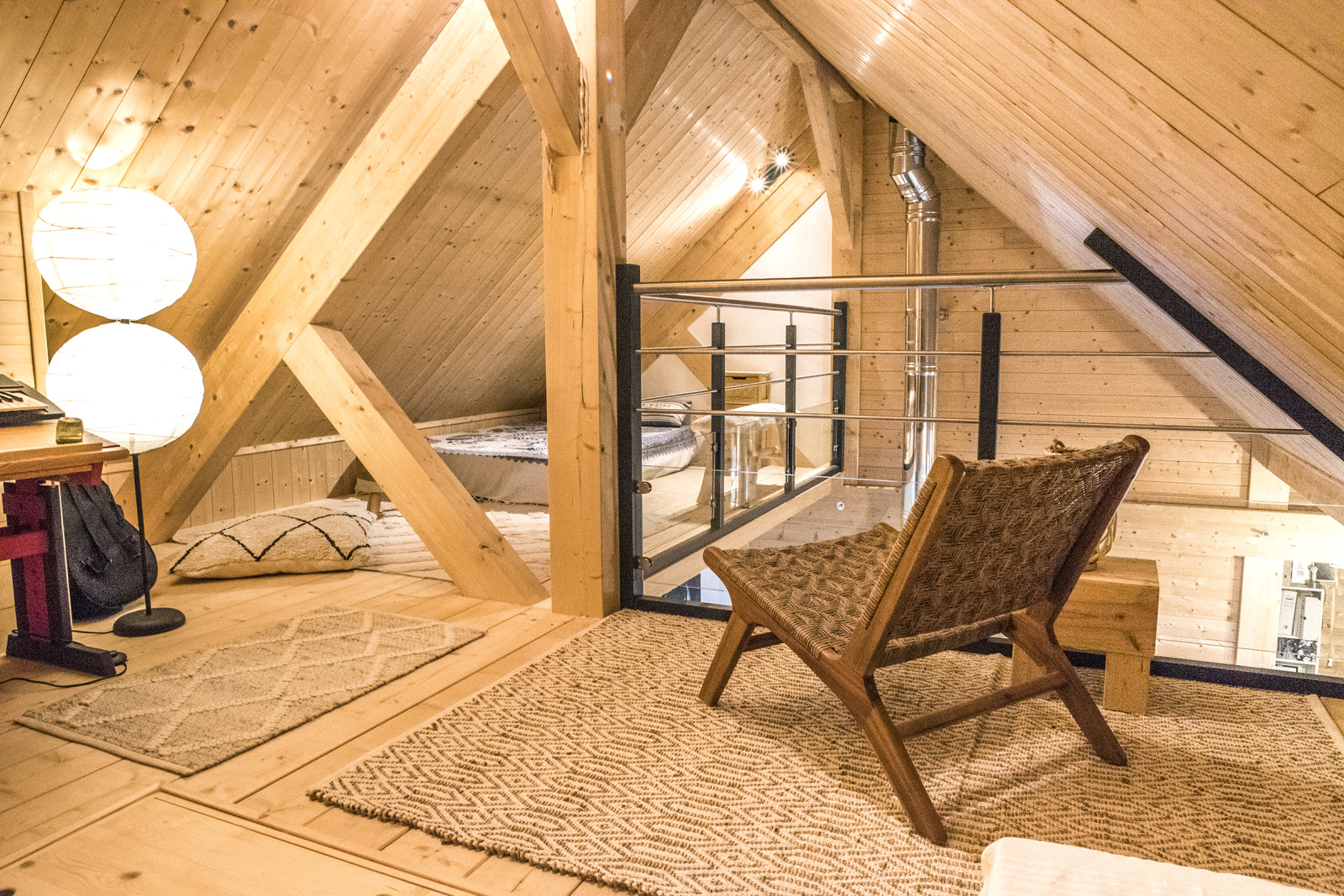 Une mezzanine supplémentaire, pensée pour un coin lecture et un lit d'appoint, vous permet de vous évader tout en admirant la structure unique de cette maison.